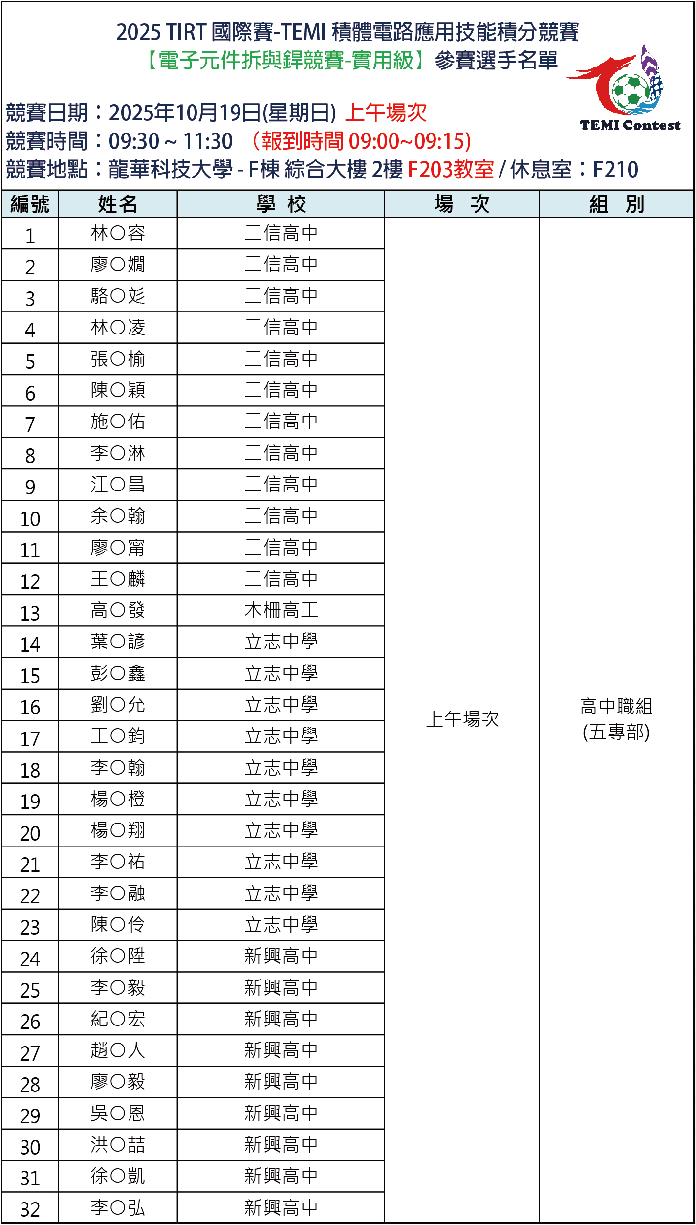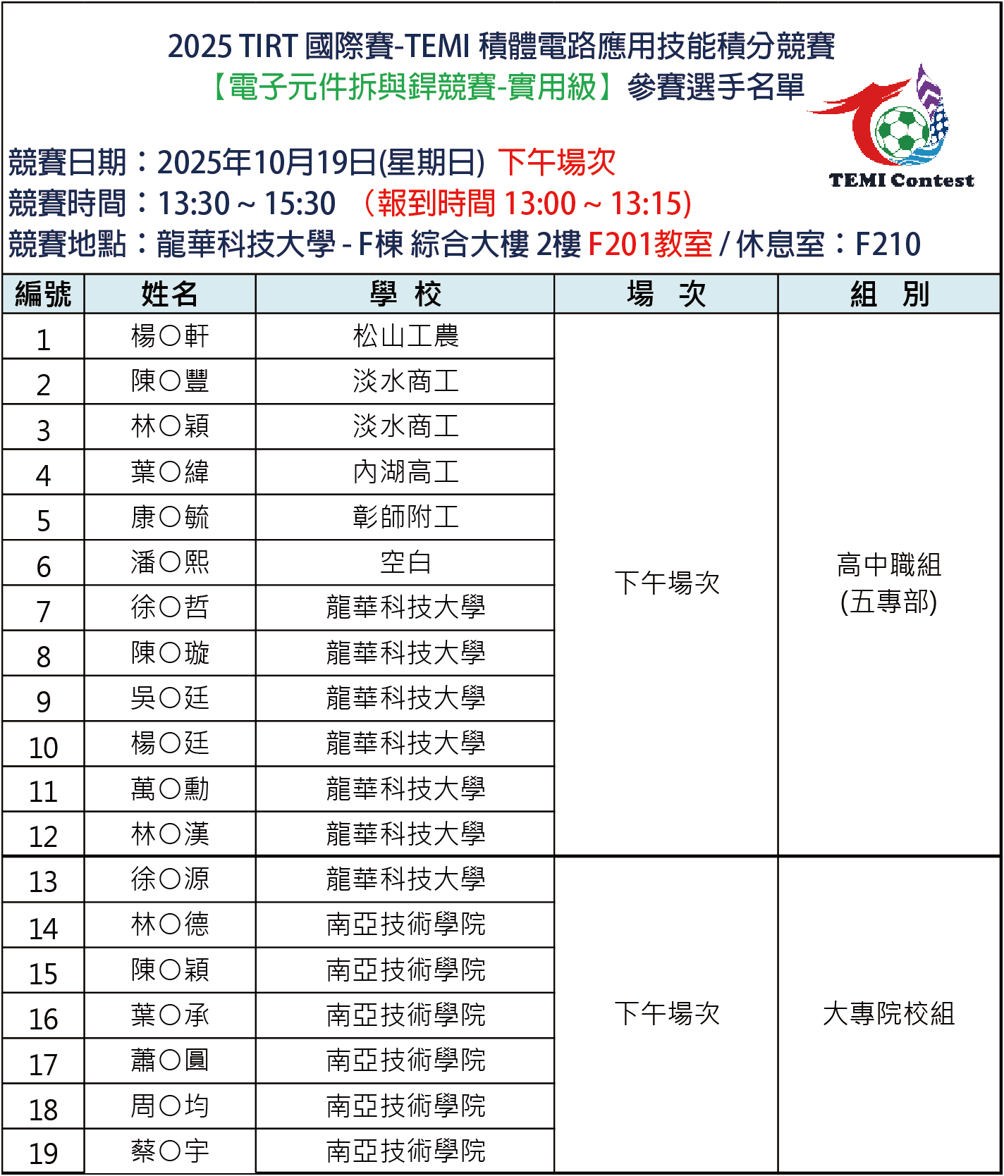 【電子元件拆與銲競賽-實用、專業級】場次、選手名單 公告如下: