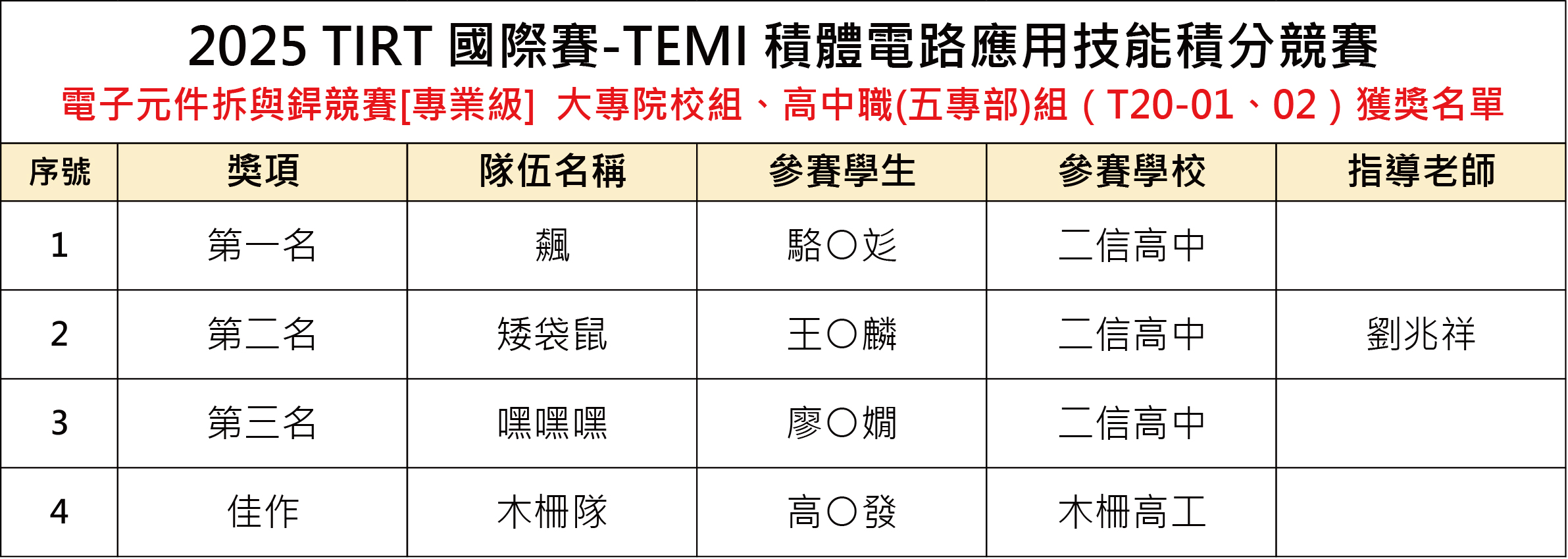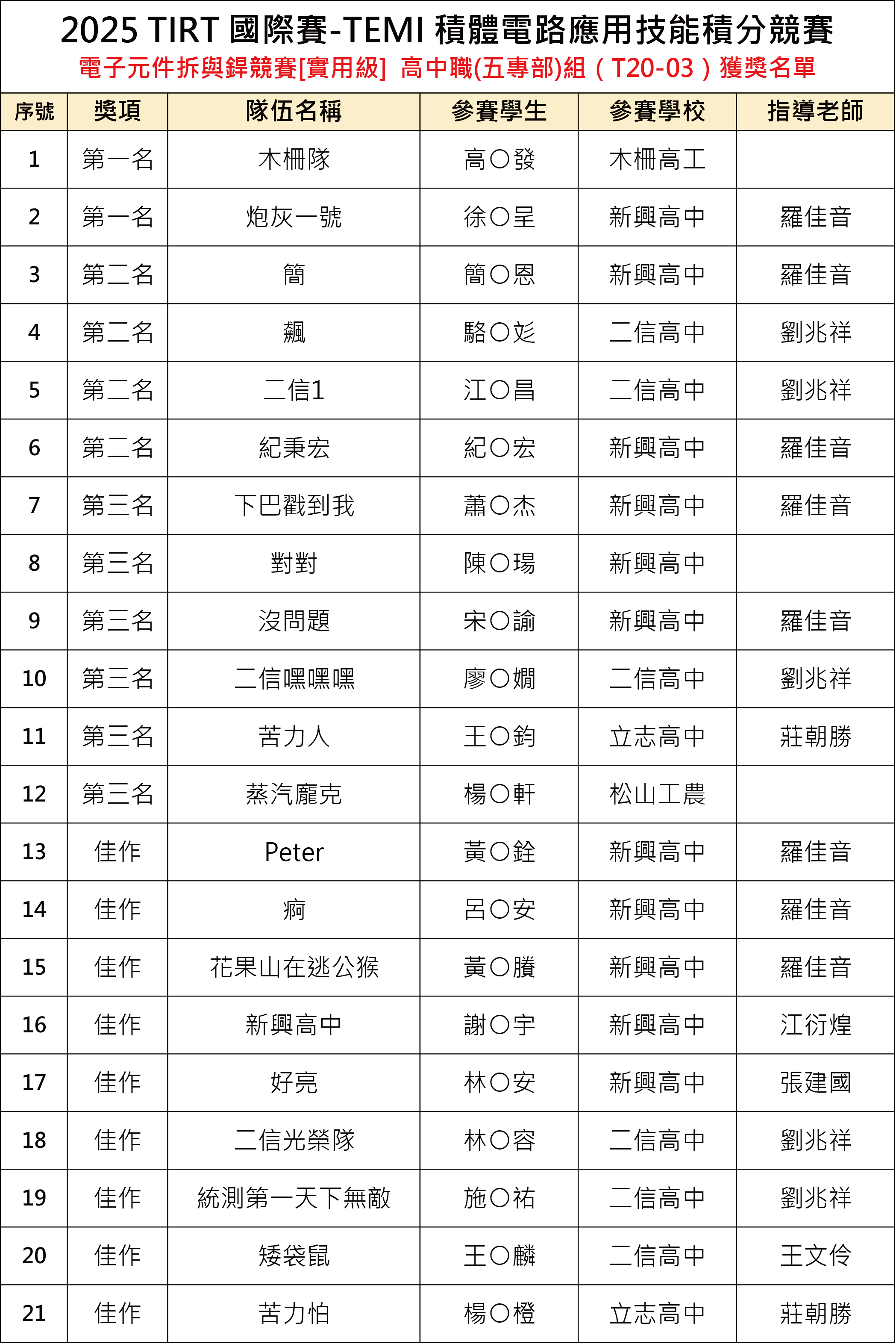 [積體電路應用系統-10/18電路板設計競賽、10/19電子元件拆與銲競賽] 獲獎名單公告如下: